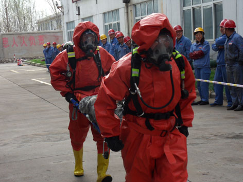 為了進(jìn)一步普及應(yīng)急救援知識(shí),提高公司員工安全意識(shí)和應(yīng)急救援的能力,公司于4月6日上午在三胺老系統(tǒng)生產(chǎn)區(qū)舉辦了應(yīng)急救援技能競(jìng)賽,活動(dòng)分為正壓式空氣呼吸器佩戴競(jìng)賽和使用滅火器滅火競(jìng)賽兩部分。這次應(yīng)急救援技能競(jìng)賽活動(dòng)是公司今年開(kāi)展的“查身邊隱患,保職工安全,促企業(yè)發(fā)展”系列活動(dòng)之一,其目的是通過(guò)活動(dòng)的開(kāi)展,牢固樹(shù)立以人為本,進(jìn)一步強(qiáng)化安全基礎(chǔ)、推動(dòng)安全發(fā)展的理念,促進(jìn)企業(yè)加強(qiáng)教育培訓(xùn),增強(qiáng)廣大職工的安全生產(chǎn)意識(shí)、應(yīng)急救援能力和自我保護(hù)能力,杜絕違章作業(yè),抵制違章指揮,促進(jìn)公司安全生產(chǎn)工作再上新臺(tái)階。本次活動(dòng)由公司工會(huì)和安全處、生產(chǎn)技術(shù)部等共同主辦,各生產(chǎn)車(chē)間、制造部參加了競(jìng)賽??h總工會(huì)常務(wù)副主席朱樂(lè)孝及公司副總經(jīng)理逯劍、安全總監(jiān)李紹勝、公司工會(huì)副主席王曙光等出席競(jìng)賽活動(dòng)。(下圖為活動(dòng)現(xiàn)場(chǎng))